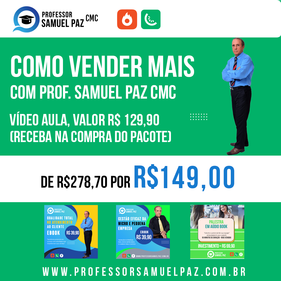 “Com anos de experiência em transformar desafios em oportunidades, o Professor Samuel Paz é um especialista em aumentar as vendas de negócios de todos os tamanhos. Sua abordagem personalizada e estratégias inovadoras garantem que cada cliente atinja seus objetivos de crescimento de maneira sustentável e eficaz.”